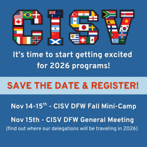 Parents are encouraged to attend the General Meeting to learn more about where CISV DFW will be sending delegations in 2026 and how to get involved in upcoming programs. Don’t miss this great opportunity to connect, learn, and get excited about the adventures ahead! Each participant will receive a CISV DFW t-shirt with their registration. The cost of the t-shirt is included with registration.